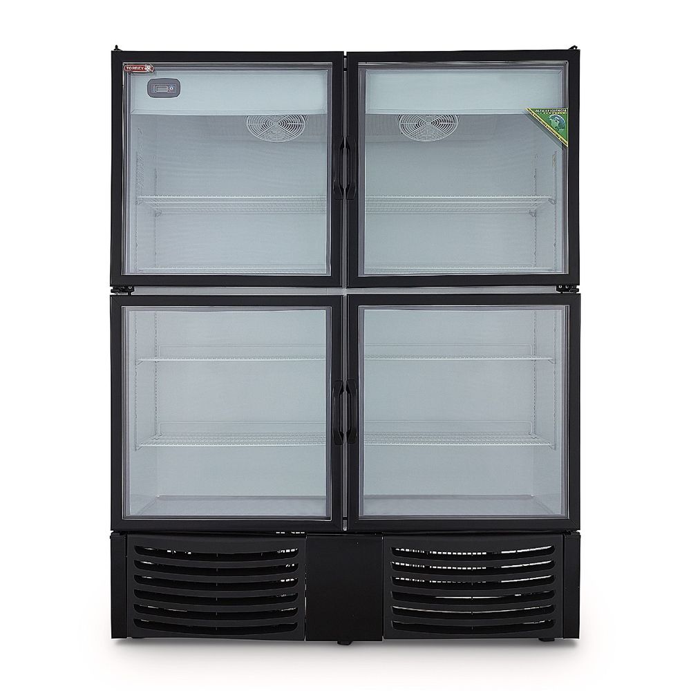 Refrigerador con cuatro puertas de cristal con capacidad de 42 pies3, fabricado en lámina con acabado blanco e iluminación interior LED de alta intensidad.