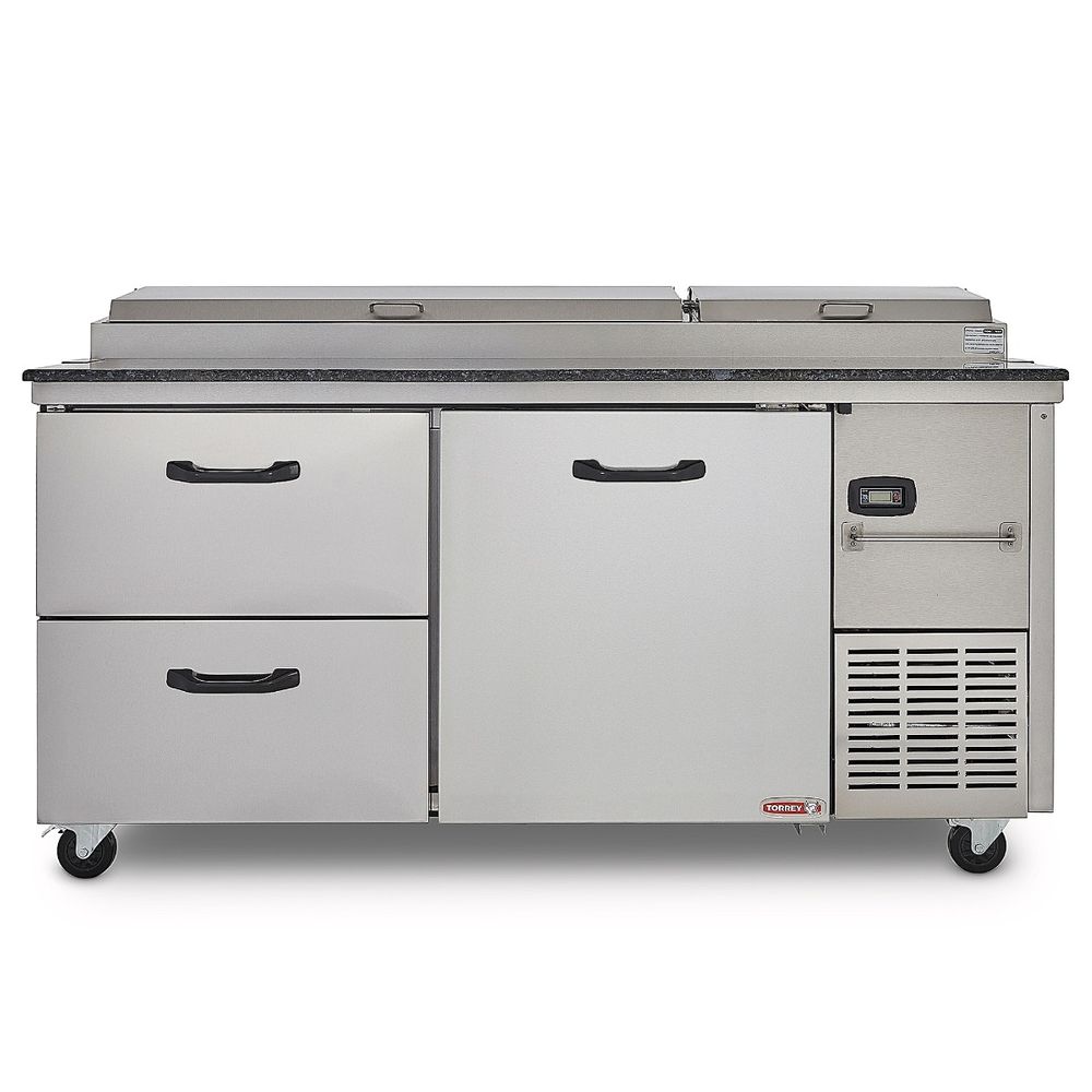 Mesa fría elaborada en acero inoxidable con placa de granito y 9 insertos de policarbonato de grado alimenticio y almacén y cajones refrigerados